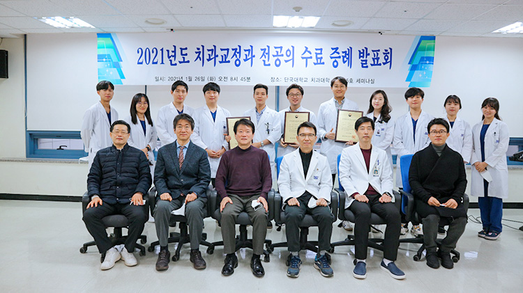 단국대학교 치과병원 3년차 전공의 수료 증례 발표회가 학교동 세미나실에서 있었다. 지난 년도 전공의 3년차 김성호, 김태현, 장영광 선생이 3년의 레지던트 수련과정을 마치며 각 “Pathologic migration을 동반한 성인 환자에서의 Rejuvenation orthodontics”, “MSE와 Facemask를 이용한 성장기 Class III 환자의 치험례”, “Skeletal-anchored facemask와 Segmental distalization을 이용한 성장기 Class III 환자의 치험례”에 대하여 발표하였다.