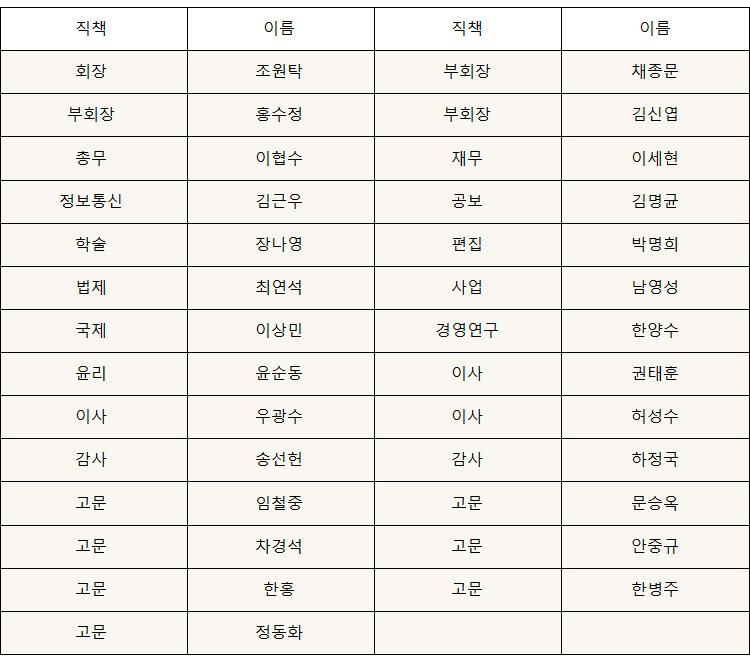 이번 이사회에선 작년 10월 22일 제23차 정기총회 때 연임, 유임, 그리고 새로이 선출된 신임 임원 소개가 있었다. 신임 임원 명단은 다음과 같다.
