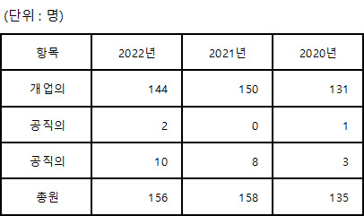 2022년 청소년치아교정지원사업 자원봉사자 신청자 신청이 5월 9일(월) 부로 마감되었습니다. 금년에는 총 156명의 학회 회원분들께서 자원봉사를 신청하셨으며, 구체적으로 개업의 144명, 봉직의 10명, 공직의 2명이었습니다.