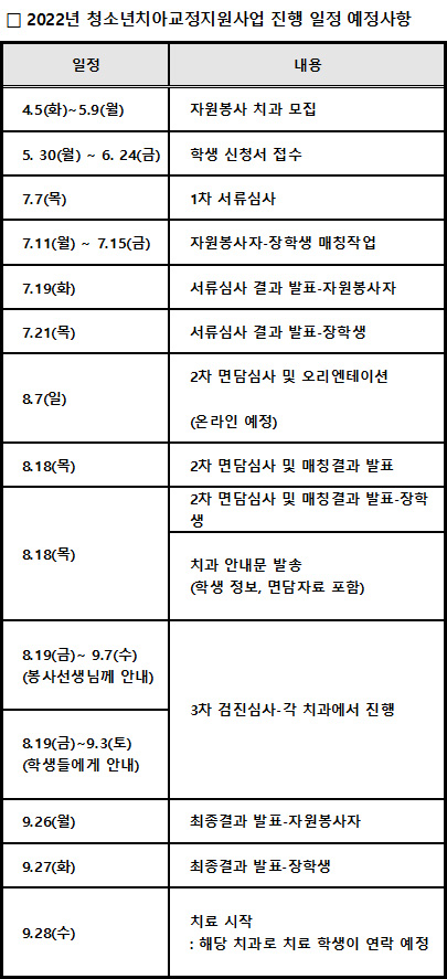 자원봉사자 선생님들의 참고의견 취합하여 삼성꿈장학재단 측에 전달하였으며 5월 30일부터 6월 24일까지 삼성꿈장학재단을 통해 2022년 청소년치아교정지원사업 학생 신청서를 접수 받았습니다.