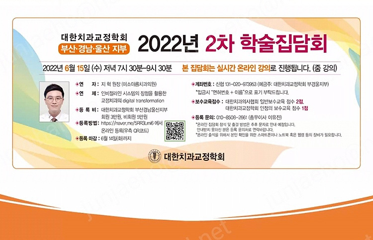 부산경남울산 2차 학술집담회에서 미소아름치과의 지혁 원장이 초청되어 ‘인비절라인 시스템의 장점을 활용한 교정치과의 digital transformation’ 이라는 연제로 강의하였다. 본 강의 에서는 인비절라인 치료시의 환자상담, 3D 구강스캐너를 이용한 자료채득, 클린체크 작성방법 및 부정교합별 치료케이스에 대한 내용이 주를 이루었으며 지혁 원장의 인비절라인 치료시 적용하는 다양한 임상경험을 들을 수 있었다.