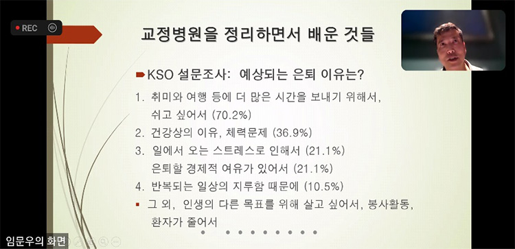 부산경남울산 1차 학술집담회에서 前 임문우 교정치과의 임문우 원장이 초청되어 ‘교정 치과를 정리하면서 배운 것들’ 이라는 연제로 강의하였다. 치과의사로서, 특별히 교정전문의로 서의 삶을 되돌아보고 ‘진정한 삶의 가치는 무엇인가? 추구해야 할 행복은 무엇인가?’를 재고해 보는 유익한 시간이었다. 임문우 원장은 미국에 거주 중이며 한국과 시차가 많이 남에도 불구하고 밤잠을 설쳐가며 실시간으로 강의를 하는 열정을 보여주어 인상 깊었다.