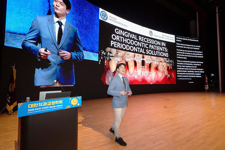 박진영 교수(연세대학교 치주과학교실)는 “Gingival Recession in Orthodontic Patients: Periodontal Solutions?”라는 주제를 통해 교정 치료 과정 중 발생할 수 있는 치은퇴축 및 치조골 소실 문제를 다루고, 이러한 문제를 지닌 환자가 치주과로 의뢰되었을 때 어떤 처치가 이루어지는지를 설명하였습니다.
